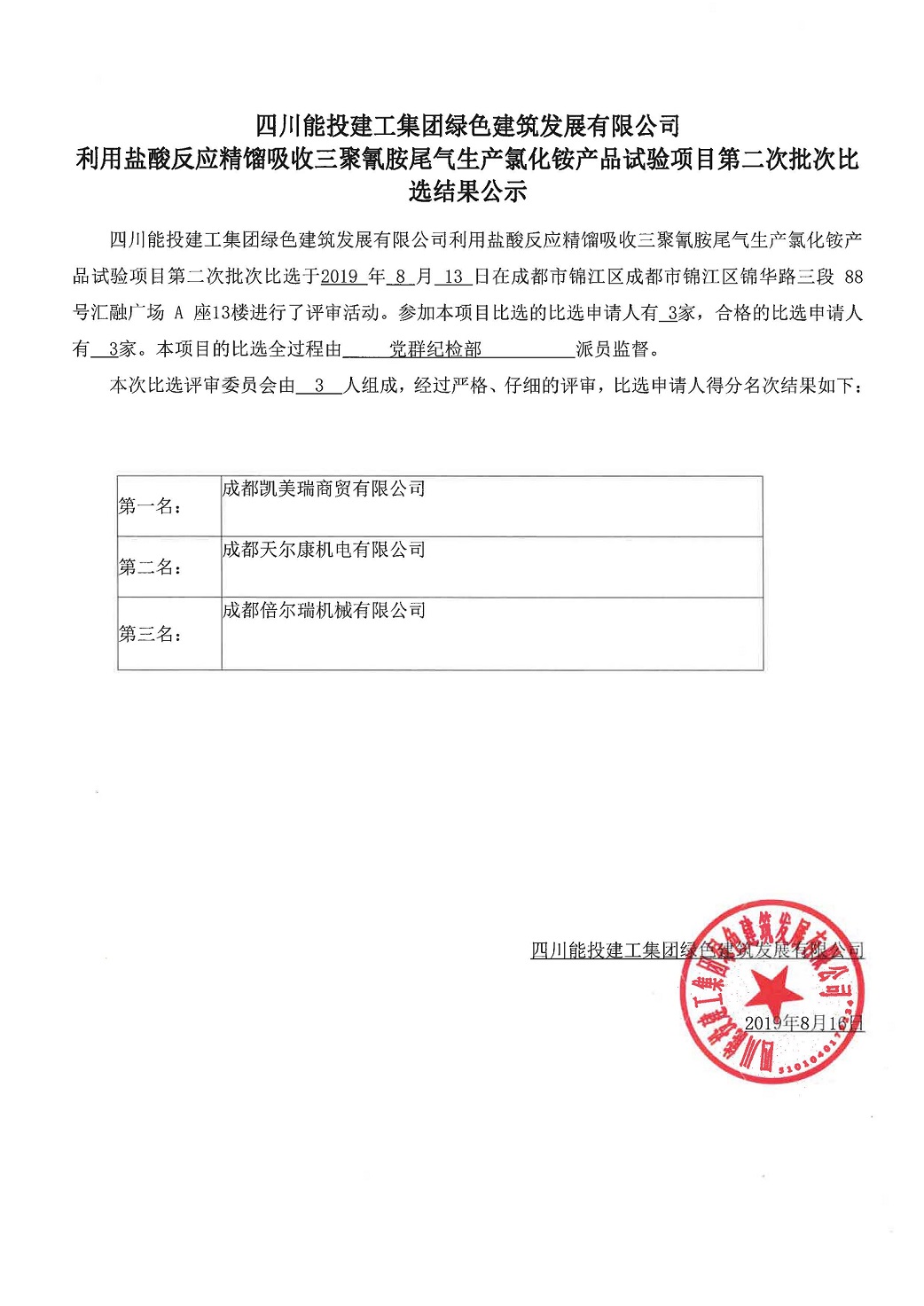 利用盐酸反应精馏吸收三聚氰胺尾气生产氯化铵产品试验项目第二批次比选结果公示