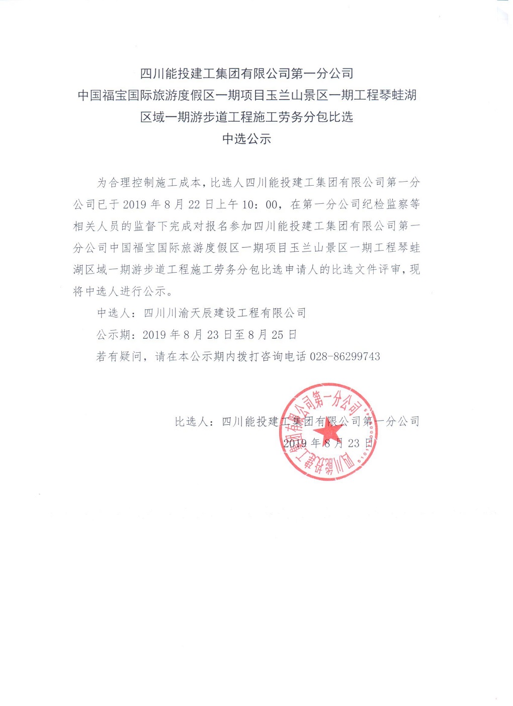 中国福宝国际旅游度假区玉兰山景区一期工程琴蛙湖区域游步道工程劳务分包中选公示