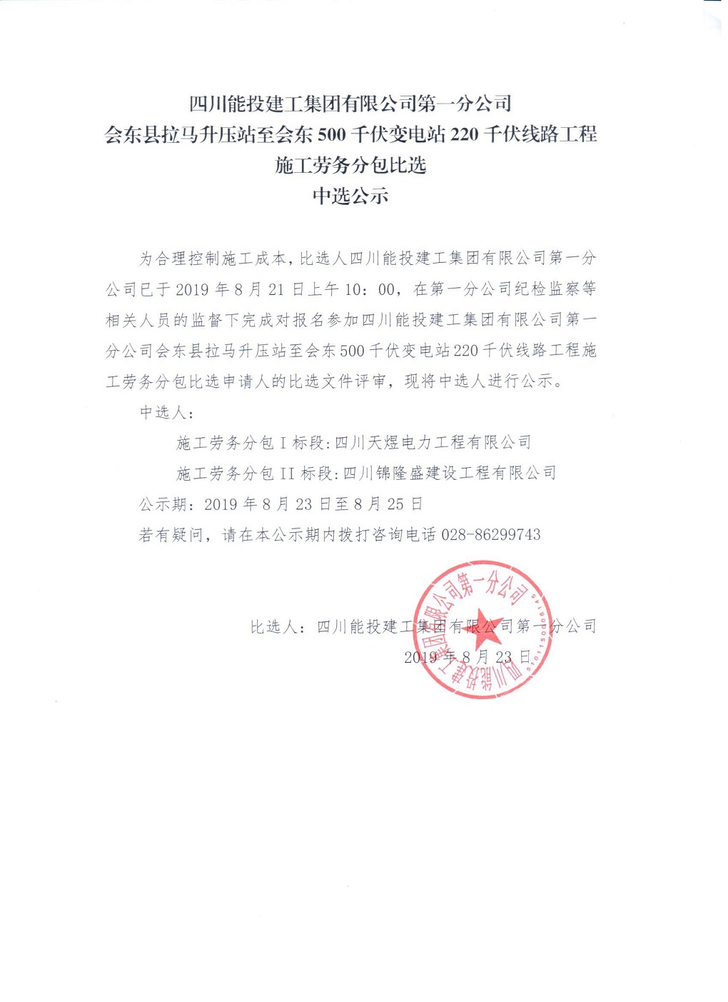 会东县拉马升压站至会东500千伏变电站220千伏线路工程施工劳务分包比选中选公示