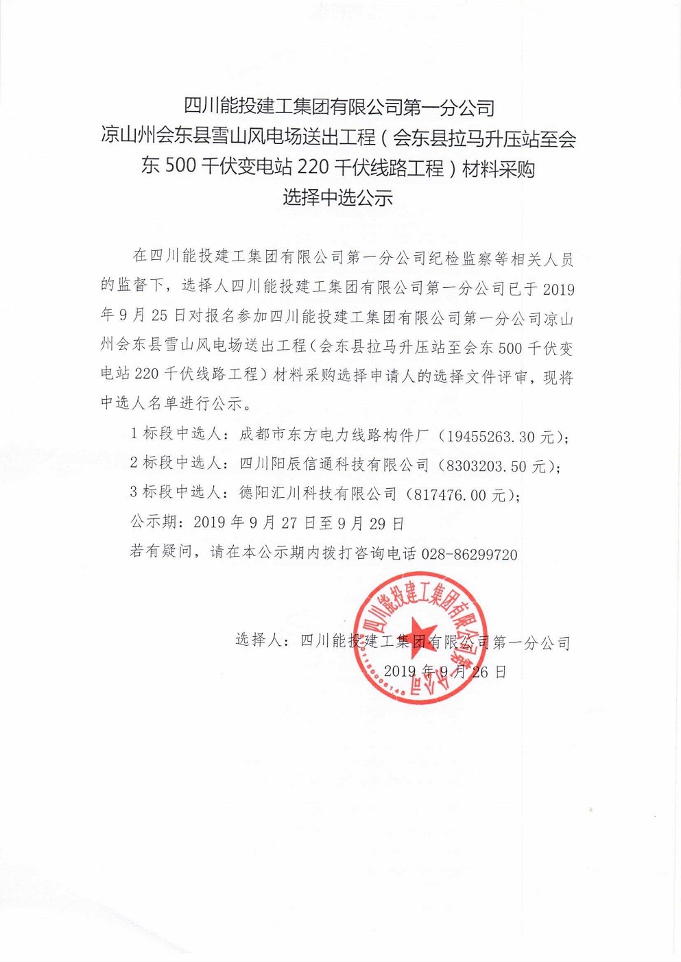 凉山州会东县雪山风电场送出工程材料采购选择中选公示