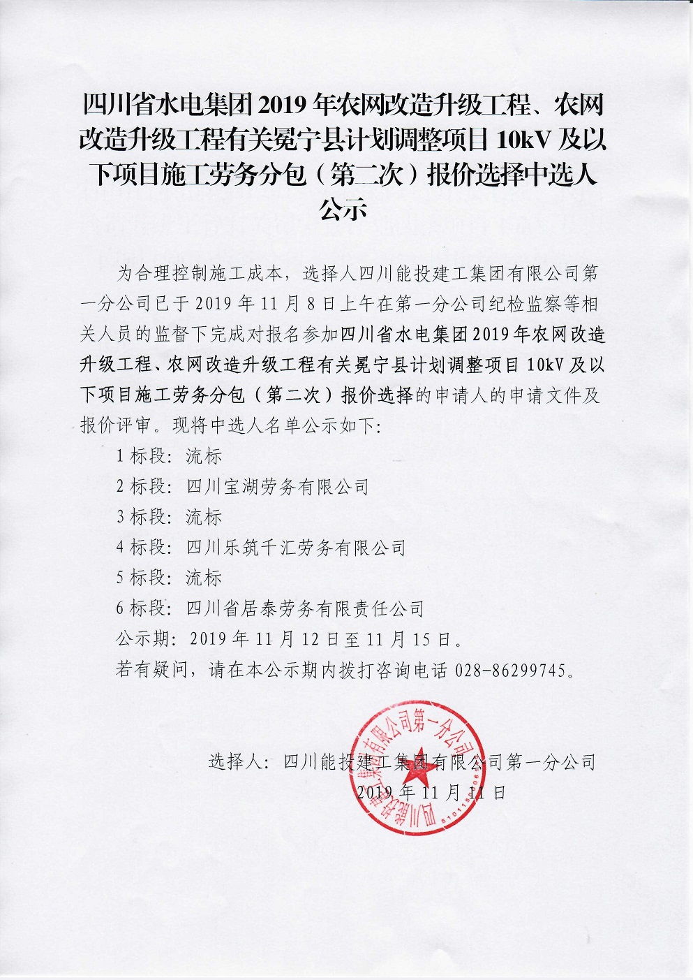 四川省水电集团2019年农网改造升级工程有关冕宁县计划调整项目10Kv及以下项目施工劳务分包(第二次)中选人公示