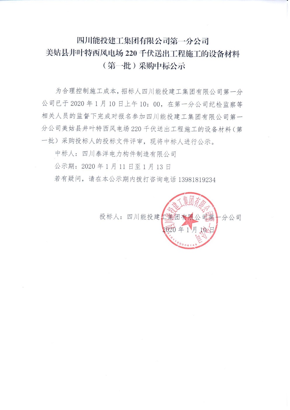 美姑县井叶特西风电场220千伏送出工程施工的设备材料(第一批)采购中标公示