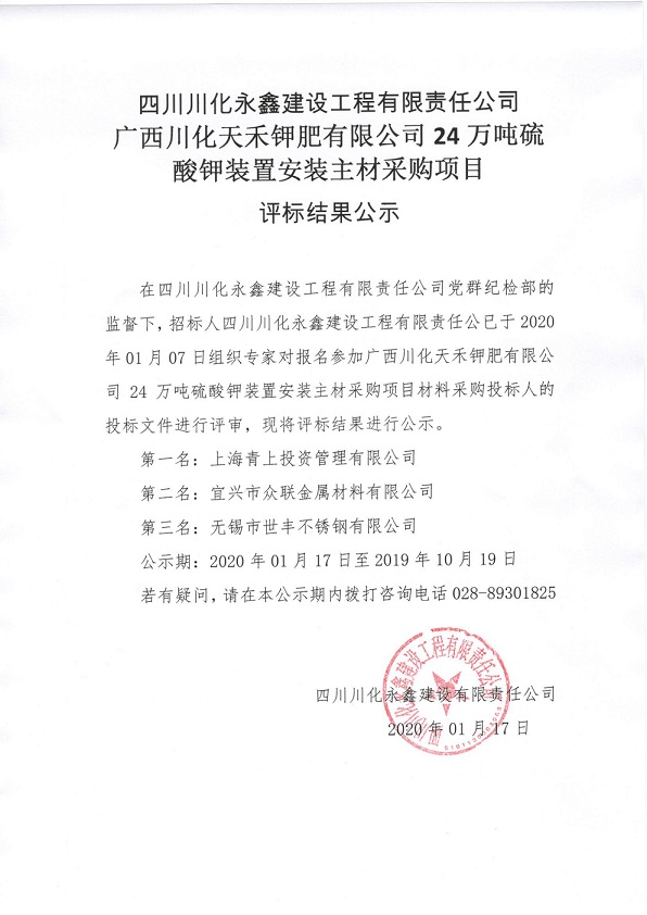 广西川化天禾钾肥有限公司24万吨硫酸钾装置安装主材采购项目评标结果公示
