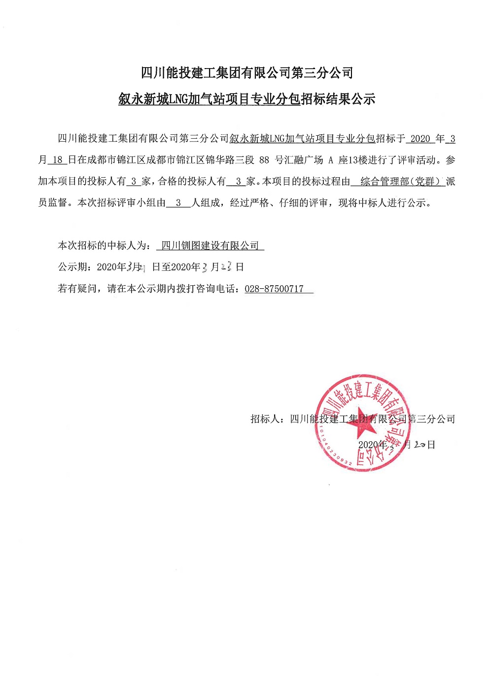 叙永新城LNG加气站项目工程劳务分包招标结果公示