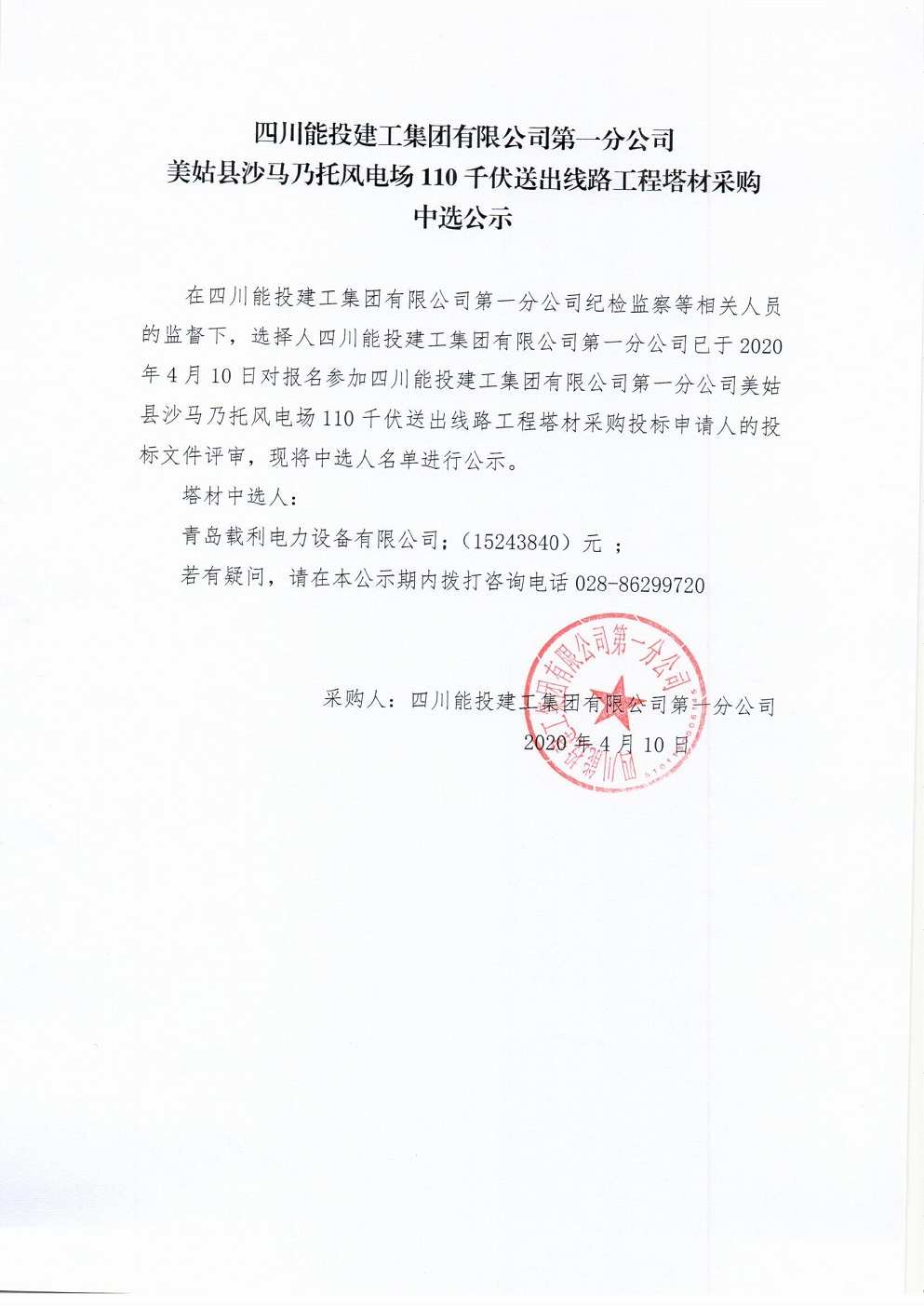 美姑县沙马乃托风电场110千伏送出线路工程塔材采购中选公示