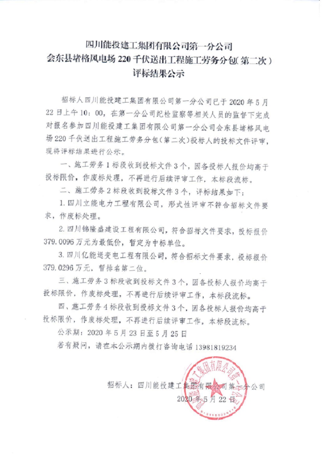 会东县堵格风电场220千伏送出工程施工劳务分包(第二次)评标结果公示