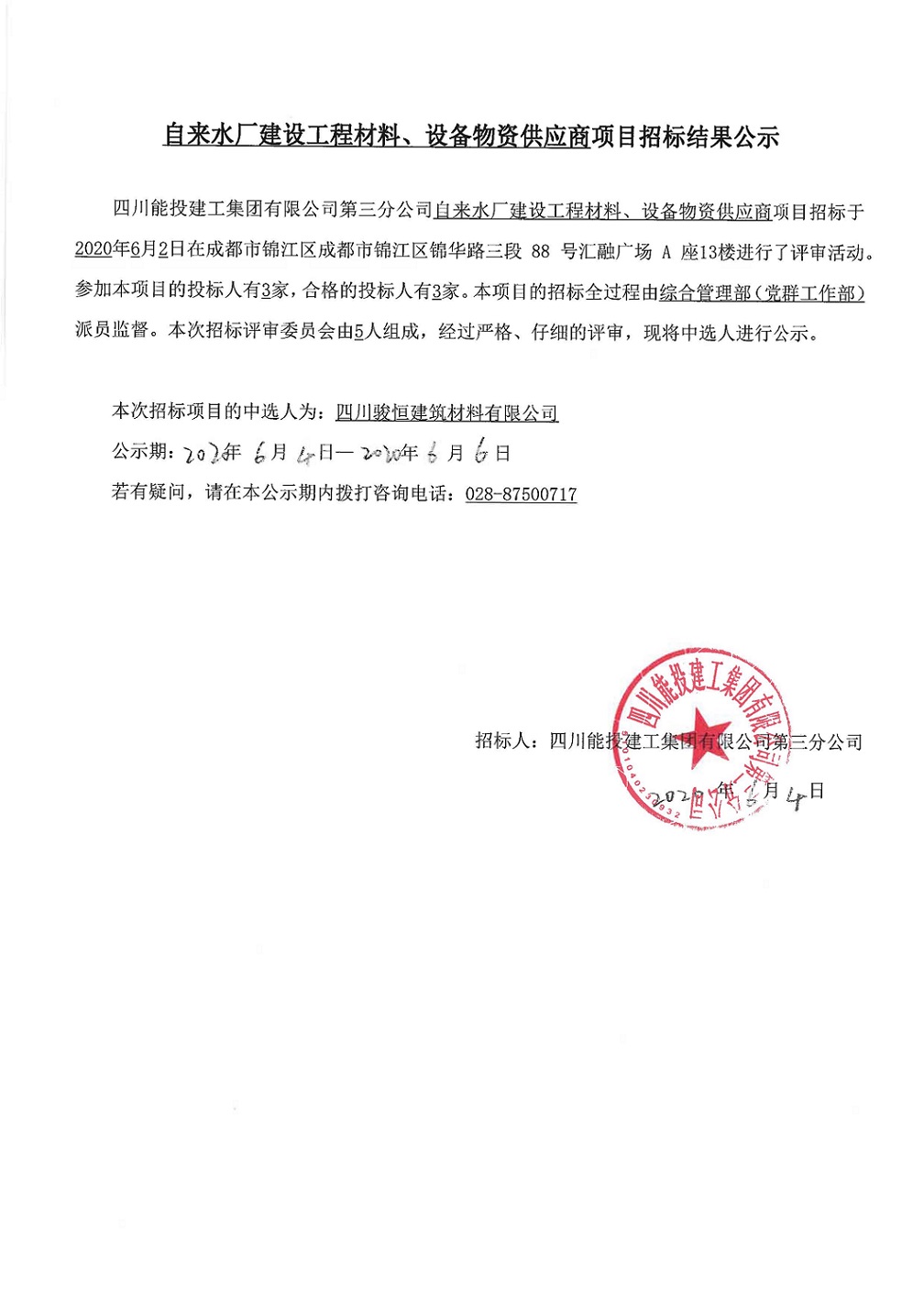 建设工程材料、设备物资供应商采购招标结果公示