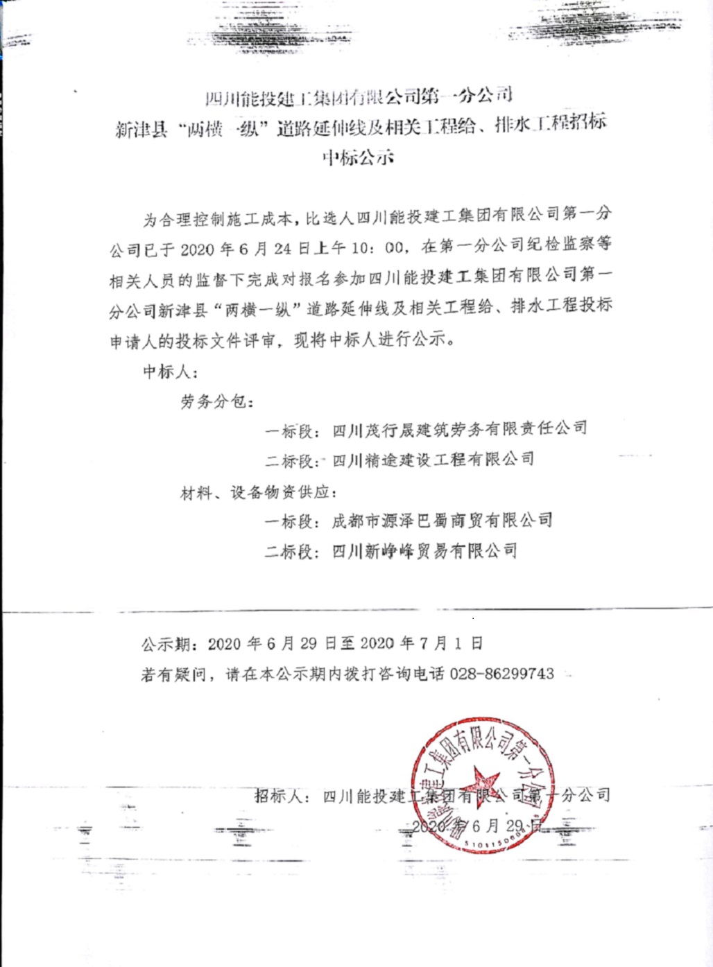 新津县“两横一纵”道路延伸线及相关工程给、排水工程招标中标公示