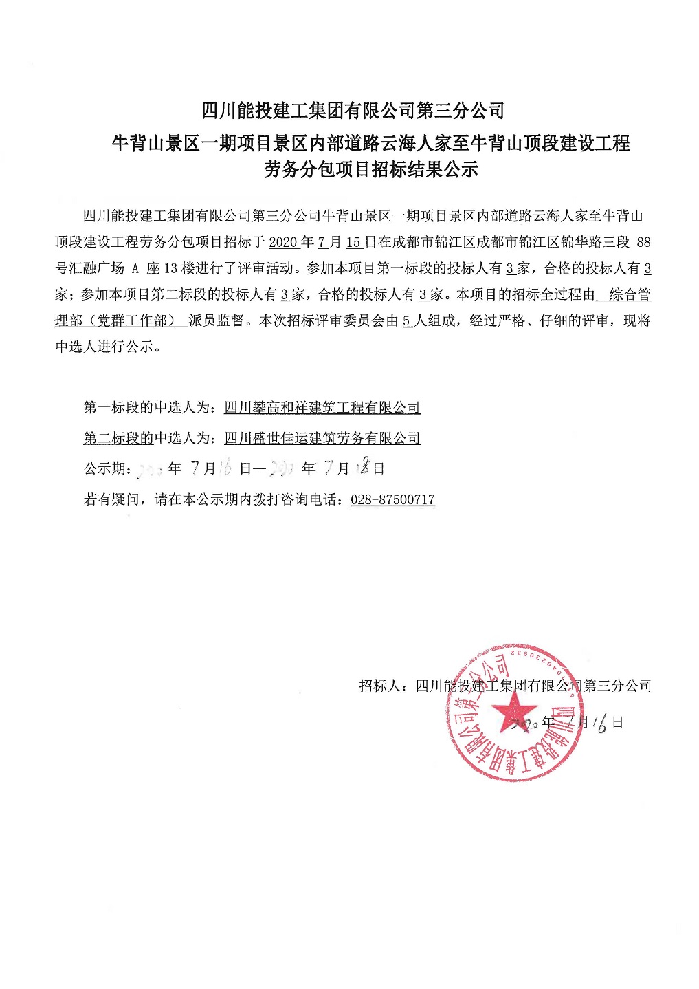 牛背山景区一期项目景区内部道路云海人家至牛背山顶段建设工程劳务分包招标结果公示