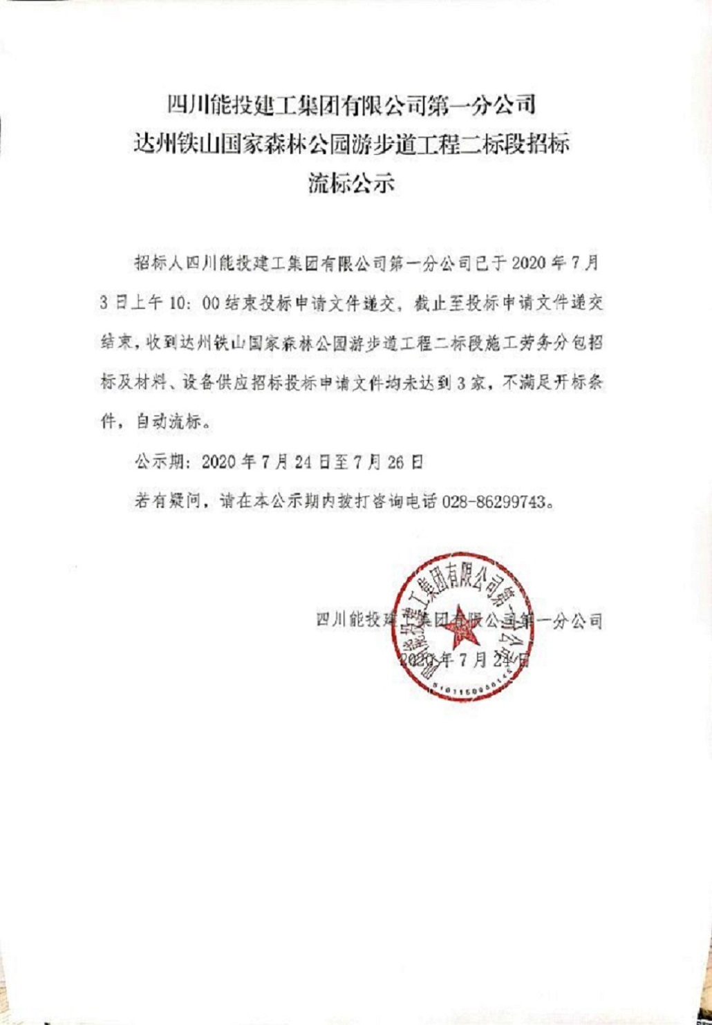 达州铁山国家森林公园游步道工程二标段招标流标公示