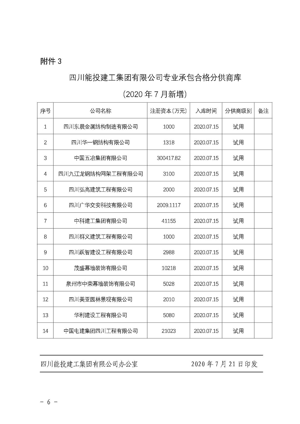 关于发布2020年7月新增《合格分供商库名单》的通知