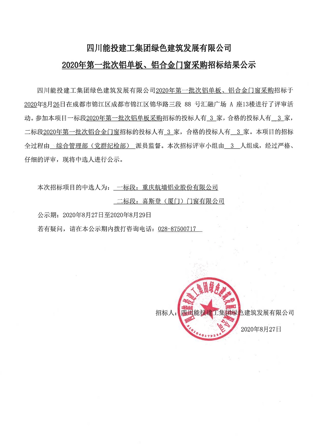 2020年第一批次铝单板、铝合金门窗采购招标结果公示