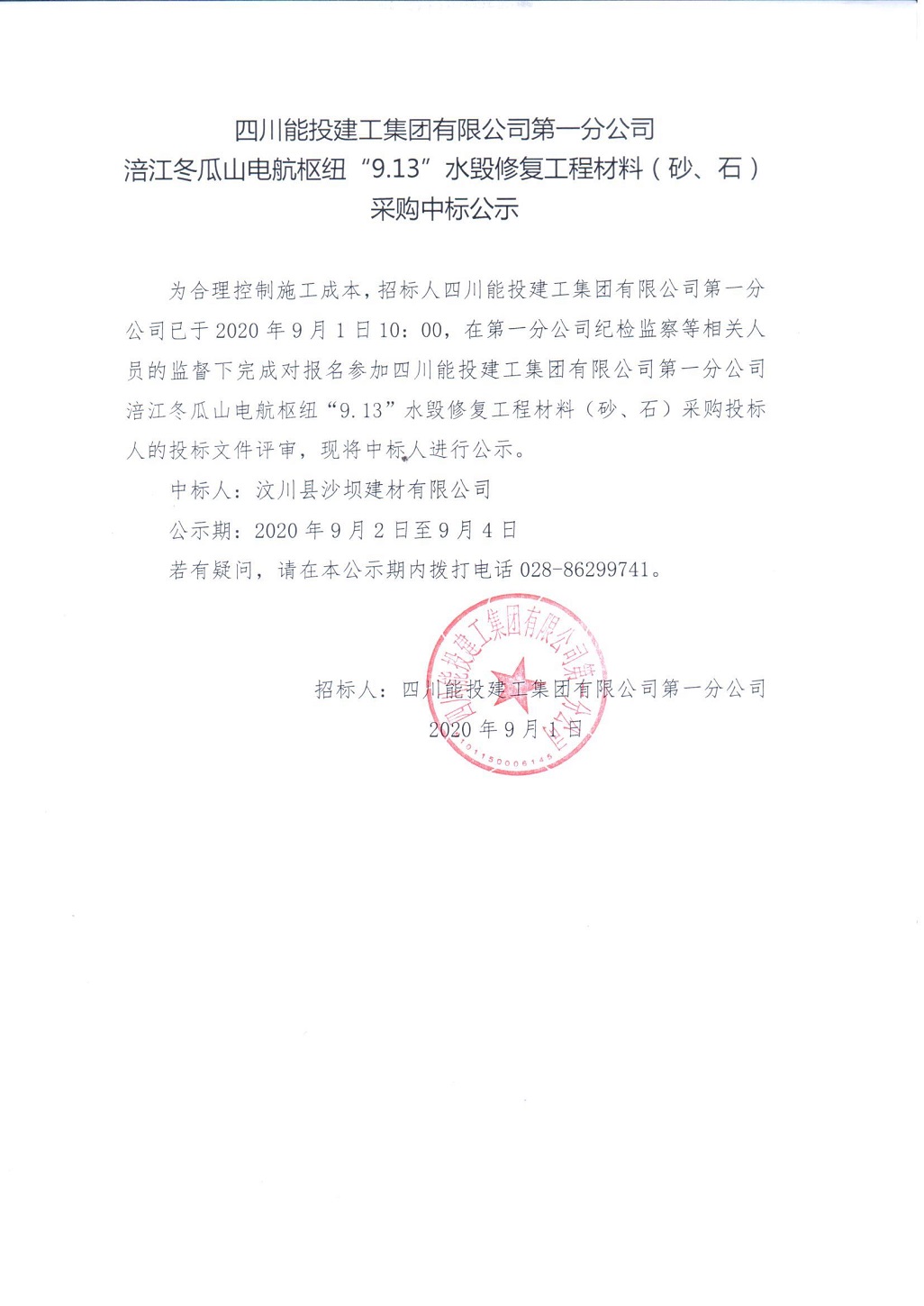 涪江冬瓜山电航枢纽“9.13”水毁修复工程材料(砂、石)采购中标公示