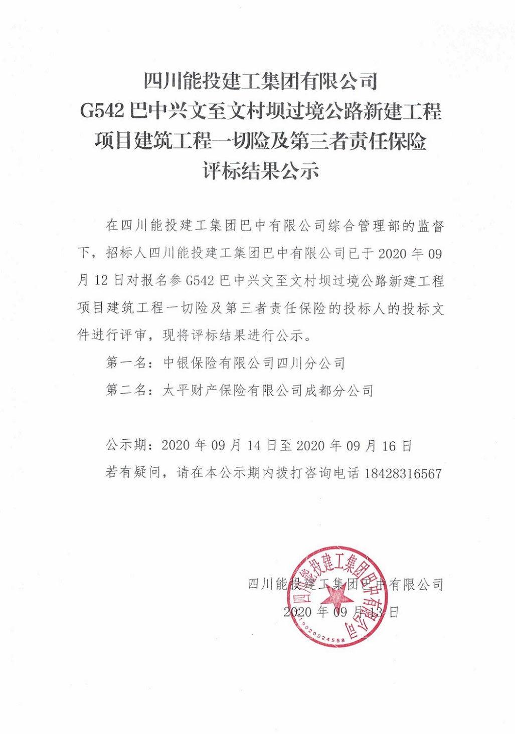 ky开元官方版G542巴中兴文至文村坝过境公路新建工程项目建筑工程一切险及第三者责任保险评标结果公示