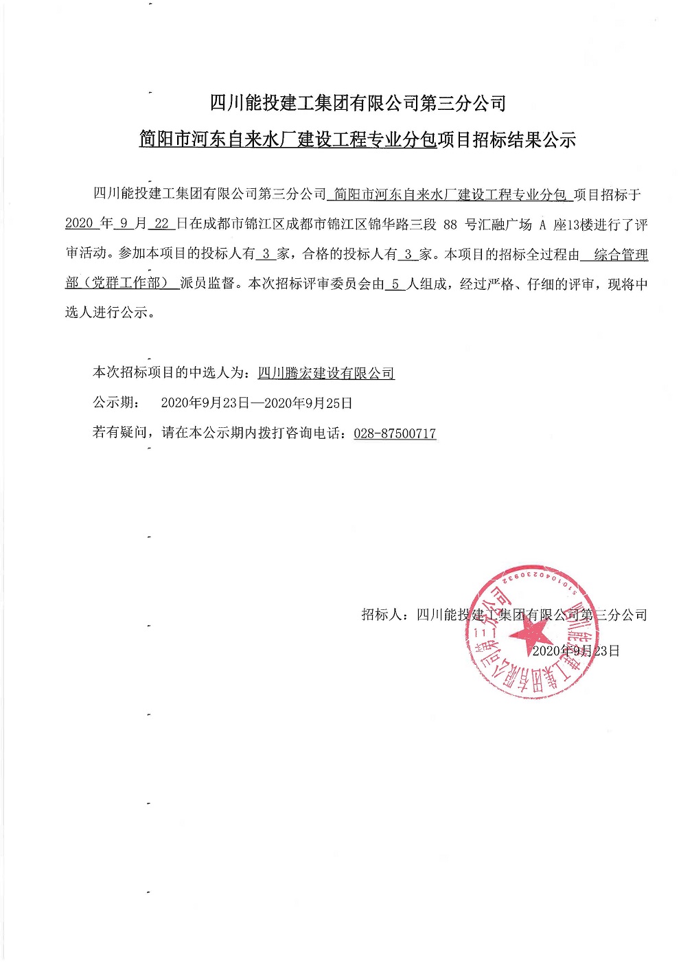 简阳市河东自来水厂建设工程专业分包项目结果公示