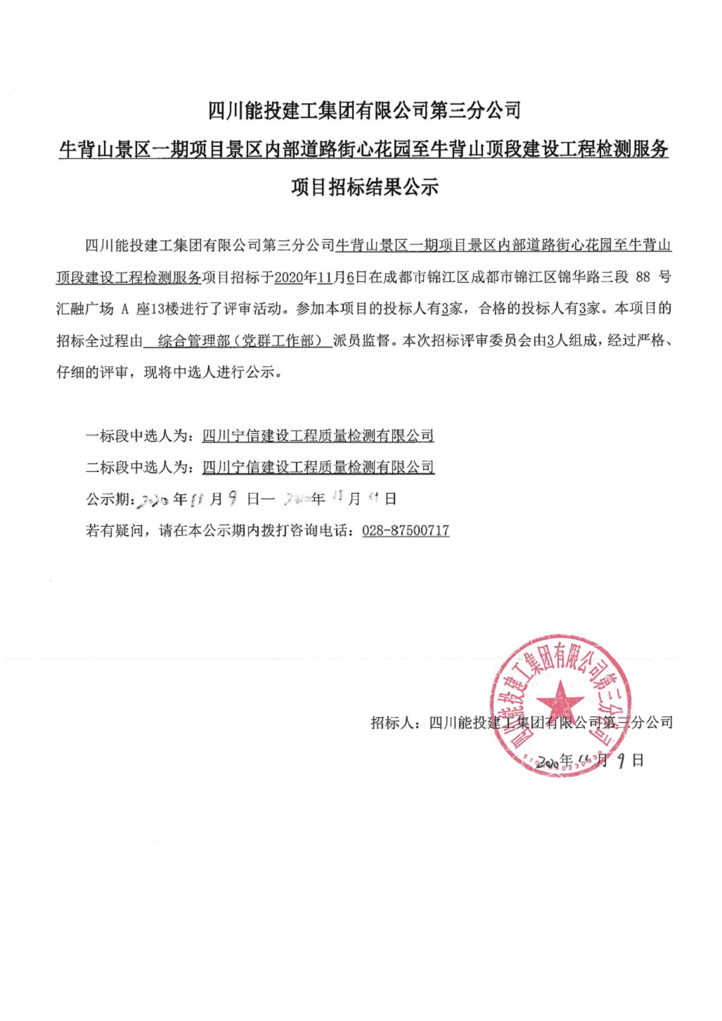 牛背山景区一期项目景区内部道路街心花园至牛背山顶段建设工程检测服务招标结果公示