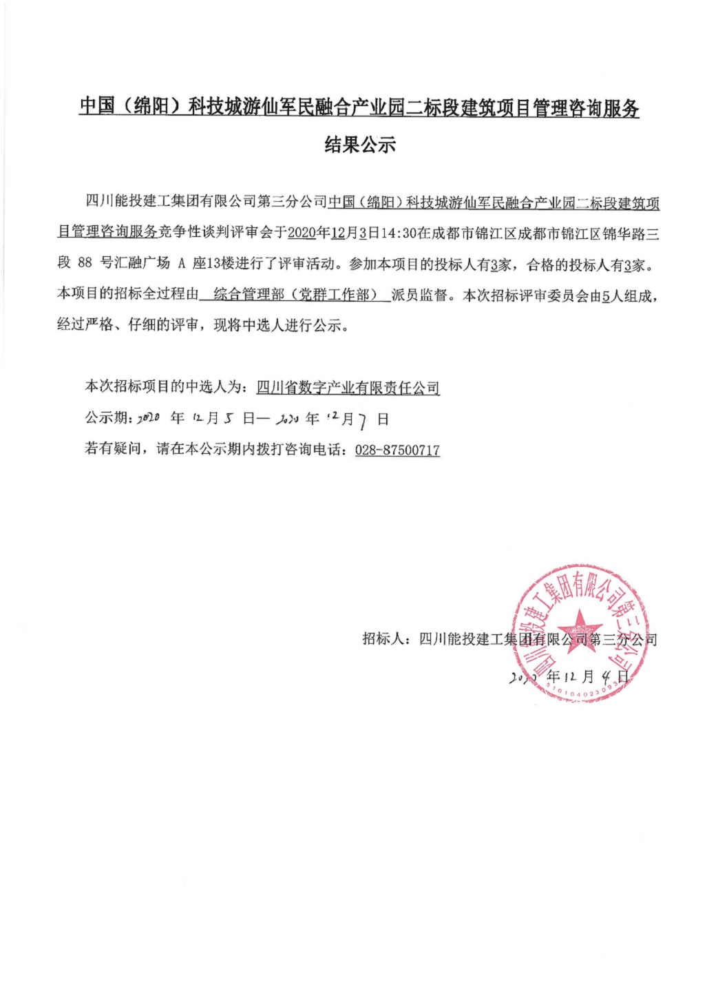 中国(绵阳)科技城游仙军民融合产业园二标段建筑项目管理咨询服务结果公示
