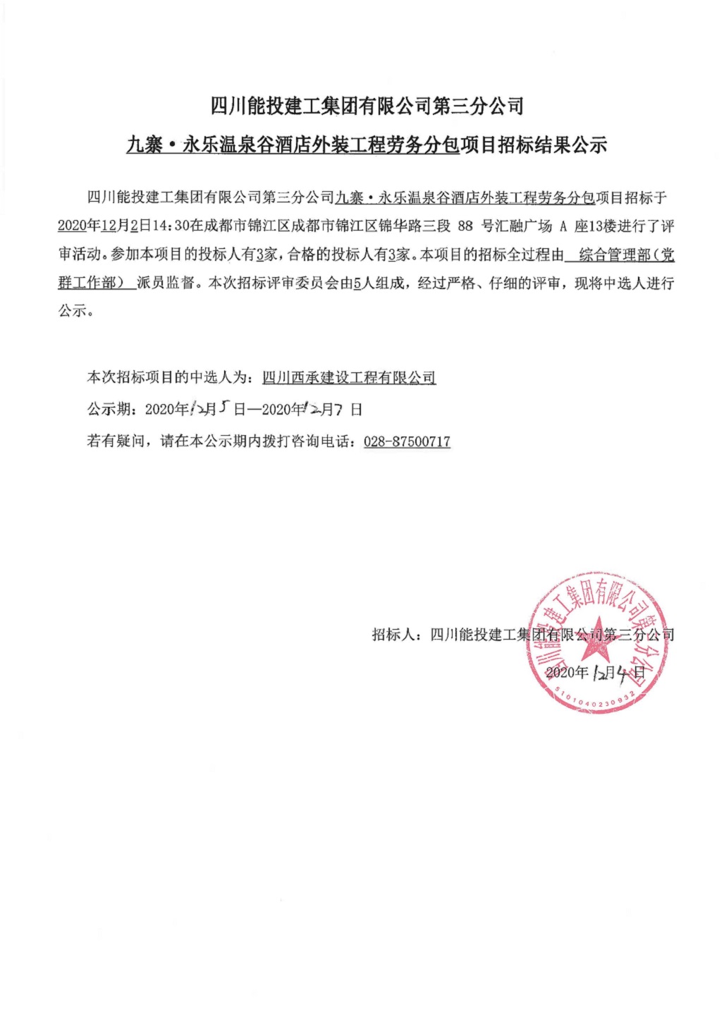 九寨·永乐温泉谷酒店外装工程劳务分包招标结果公示