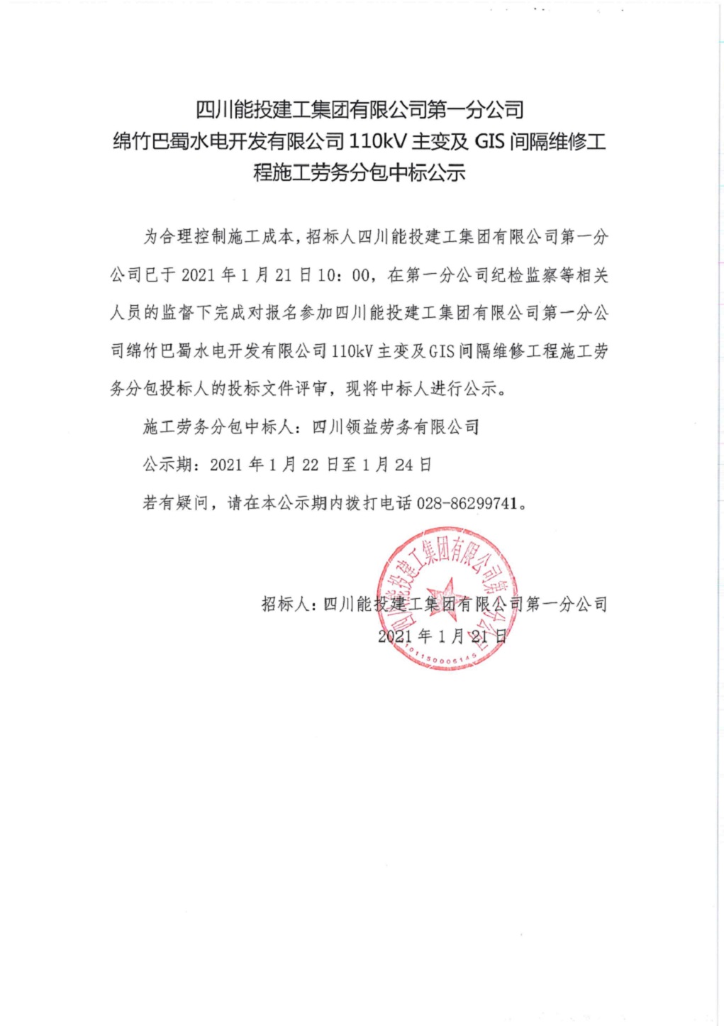 ky开元官方版第一分公司绵竹巴蜀水电开发有限公司110KV主变及GIS间隔维修工程施工劳务分包中标公示