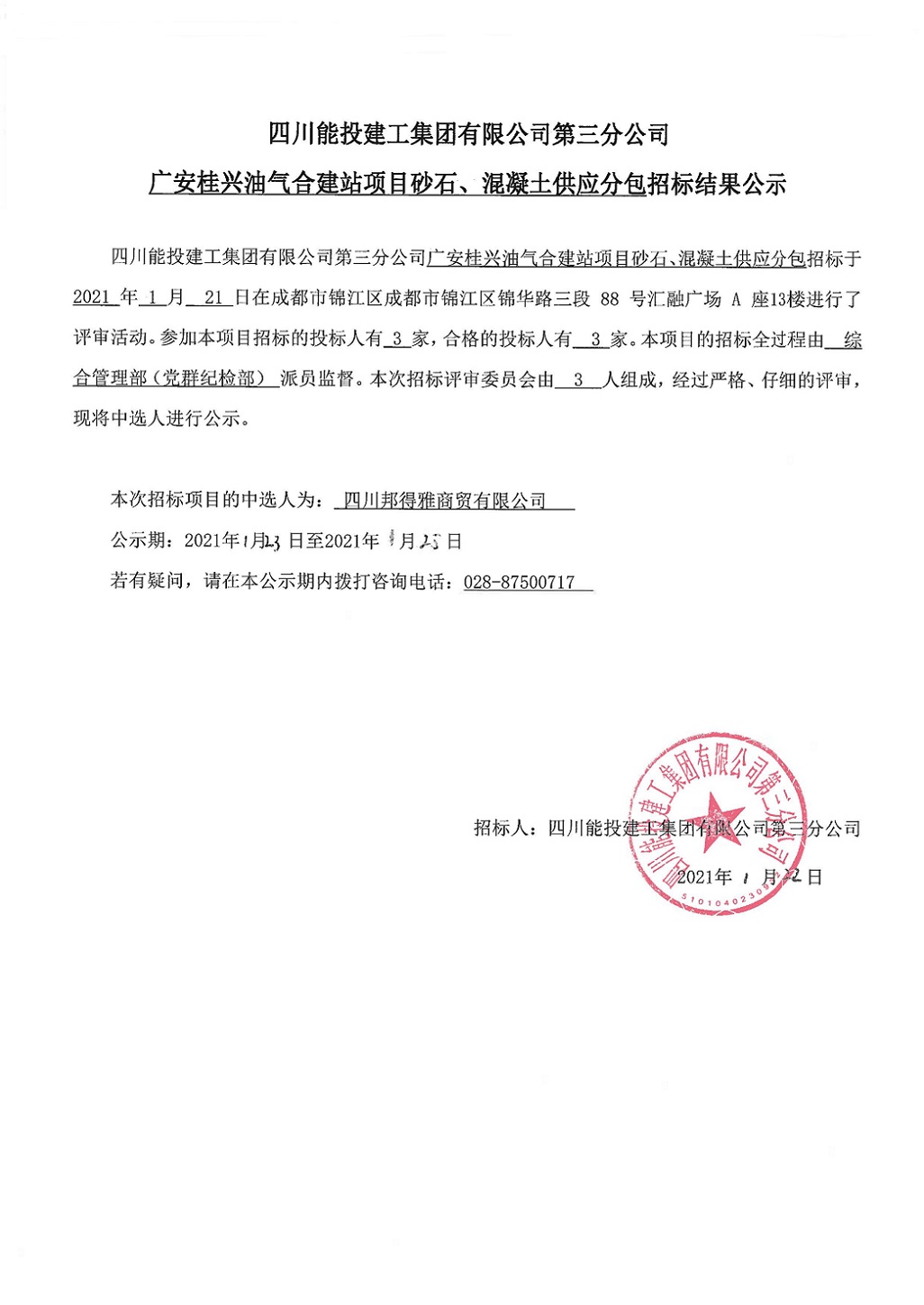 ky开元官方版第三分公司广安桂兴油气合建站项目砂石、混凝土供应分包招标结果公示