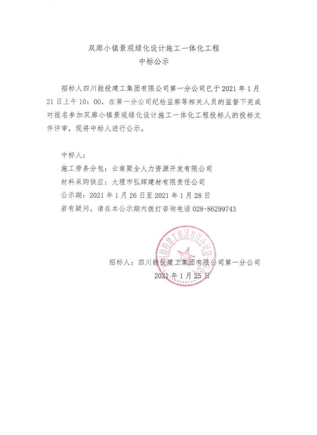 双廊小镇景观绿化设计施工一体化工程施工劳务分包、材料采购供应(第二次)中标公示