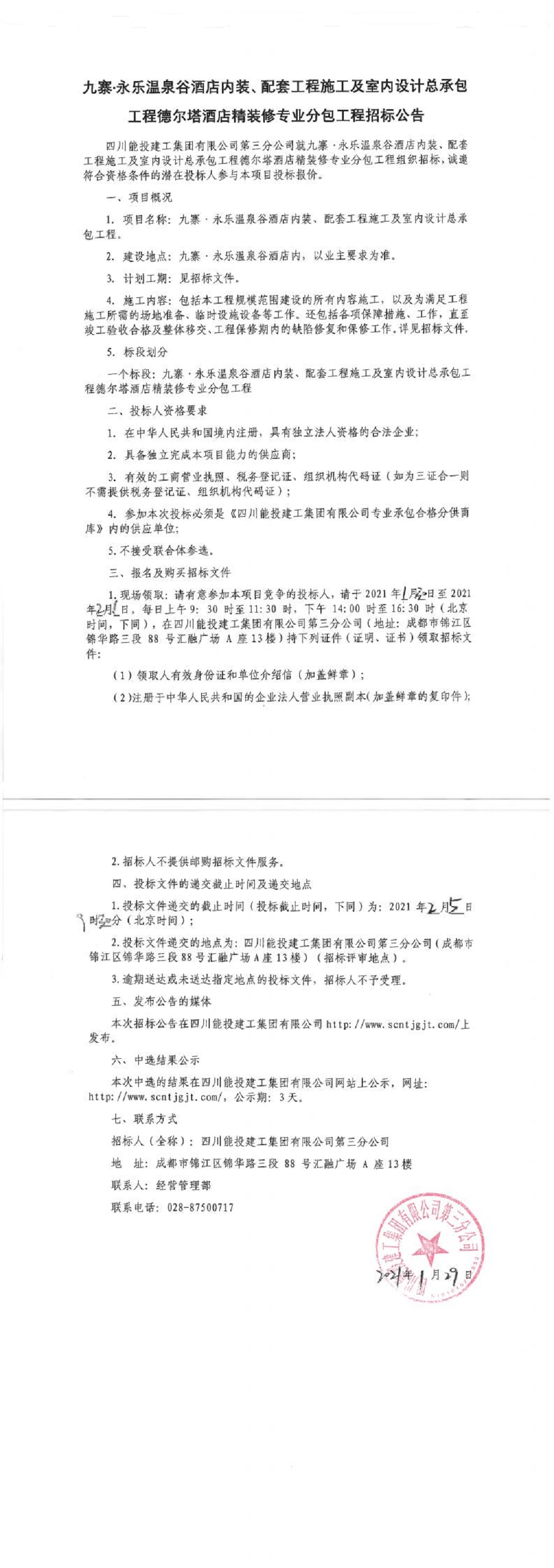 下一条:九寨.永乐温泉谷酒店内装、配套工程施工及室内设计总承包工程电梯采购.安装专业分包招标公告