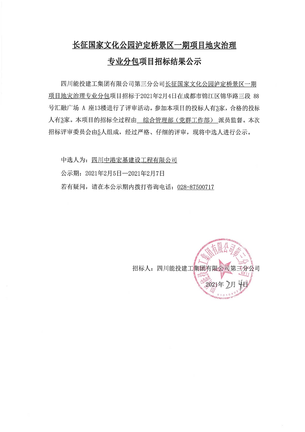 地质灾害治理专业分包招标结果公示