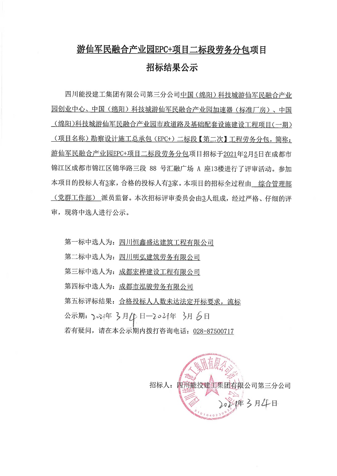 游仙军民融合产业园EPC+项目二标段劳务分包招标结果公示