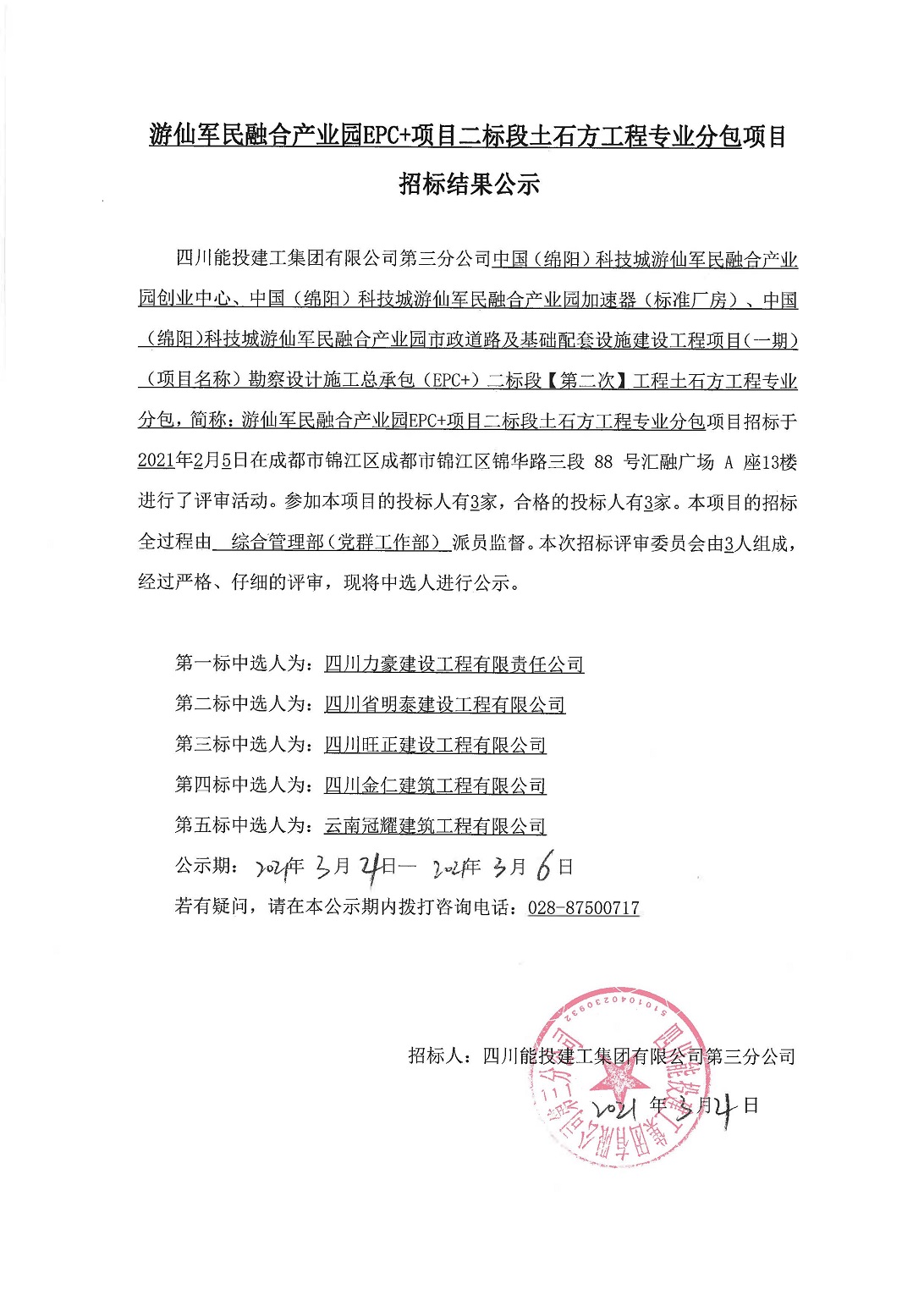 游仙军民融合产业园EPC+项目二标段土石方专业分包招标结果公示