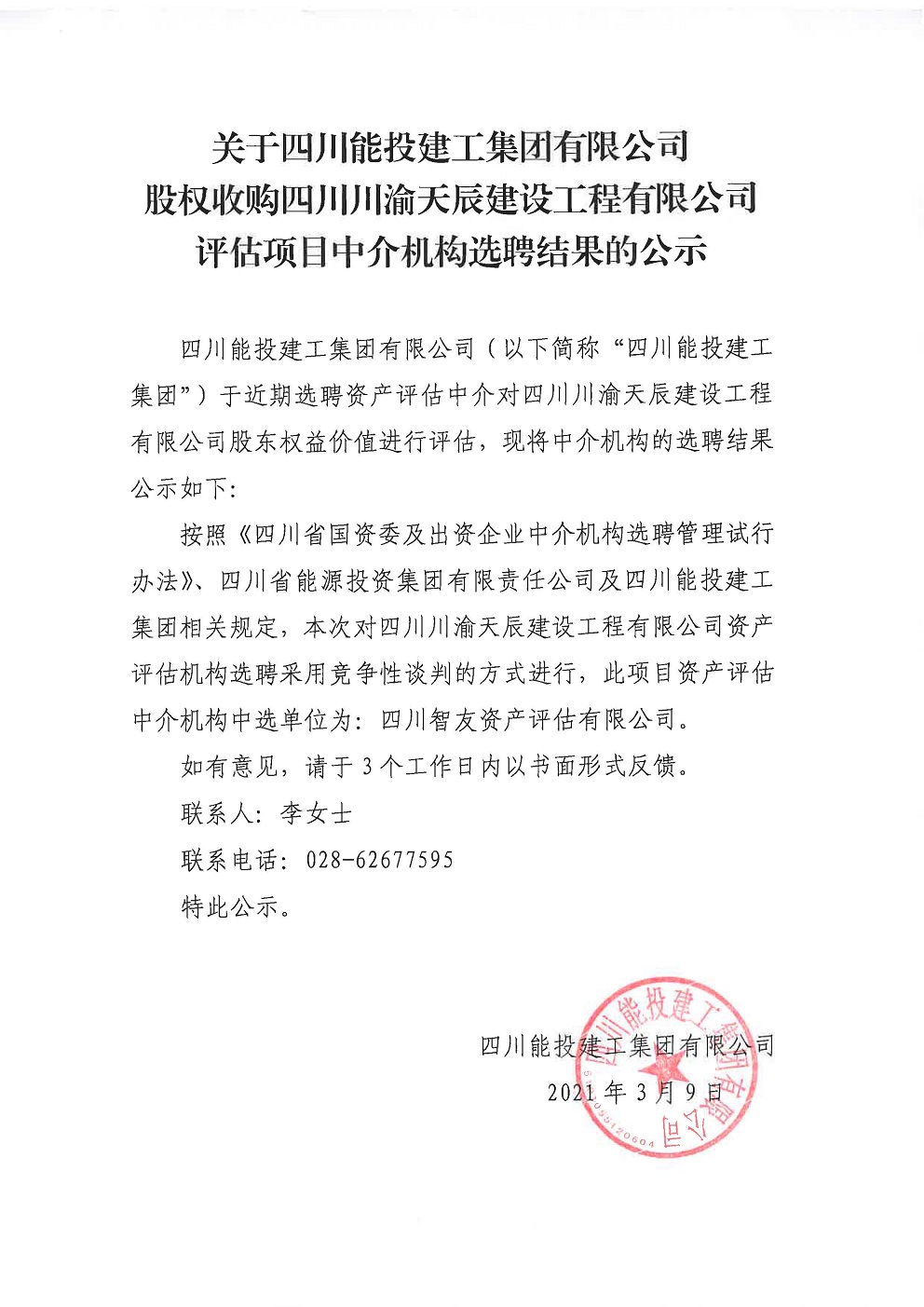 关于ky开元官方版股权收购四川川渝天辰建设工程有限公司评估项目中介机构选聘结果的公示