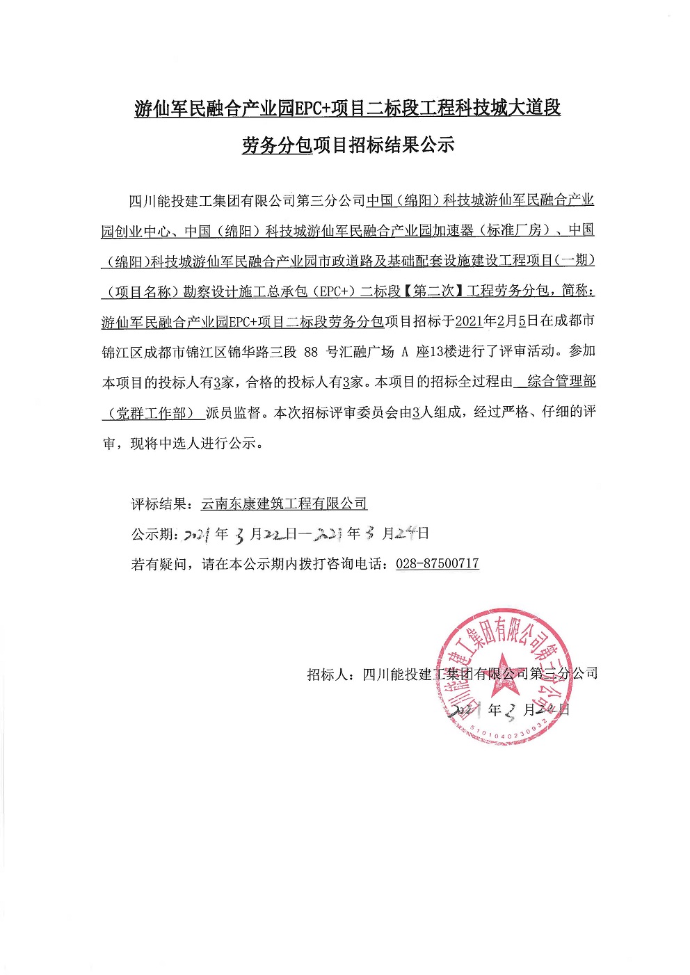 游仙军民融合产业园EPC+项目二标段工程科技大道段劳务分包项目招标结果公示