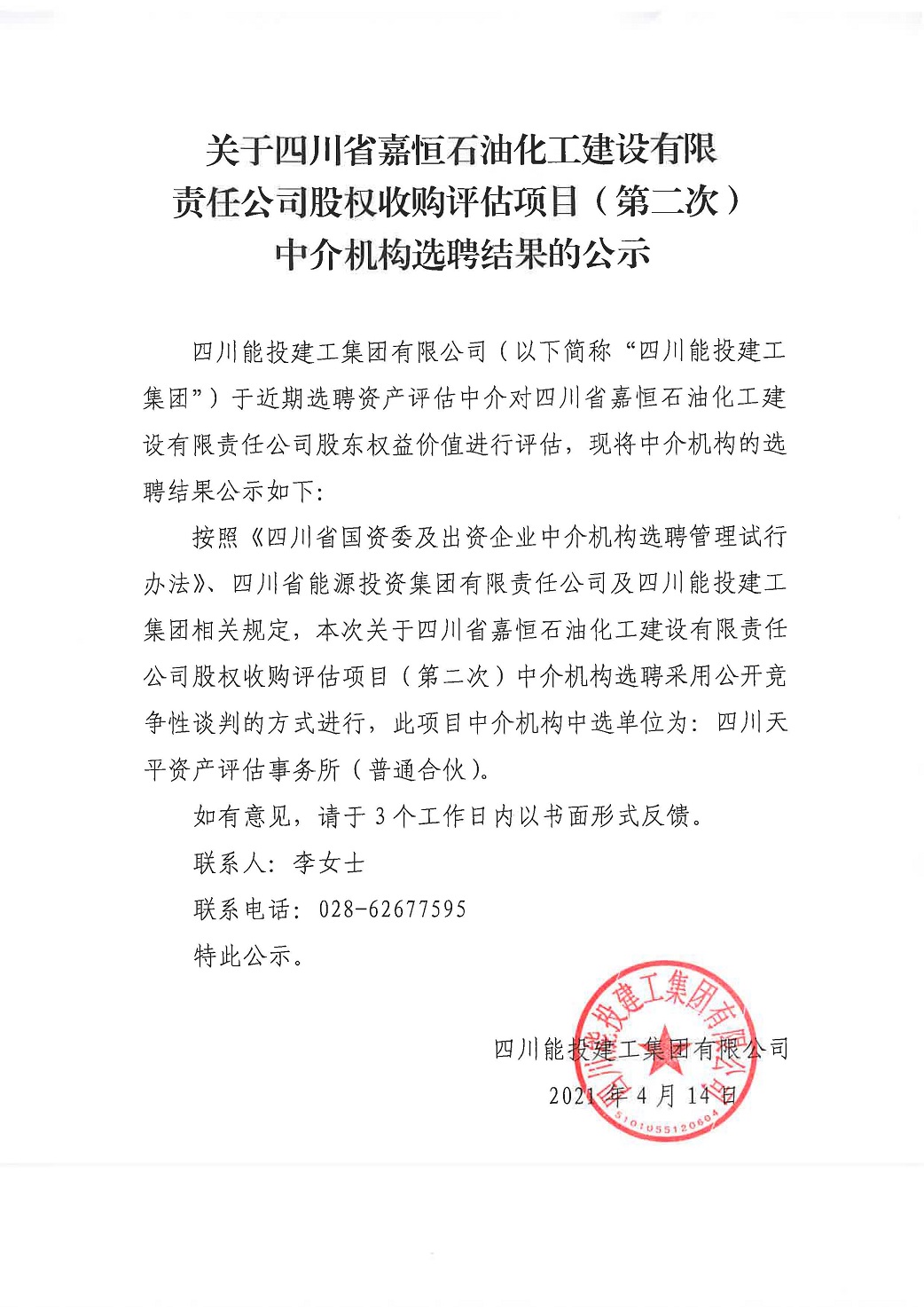 关于四川省嘉恒石油化工建设有限责任公司股权收购评估项目中介机构选聘(第二次)结果公示