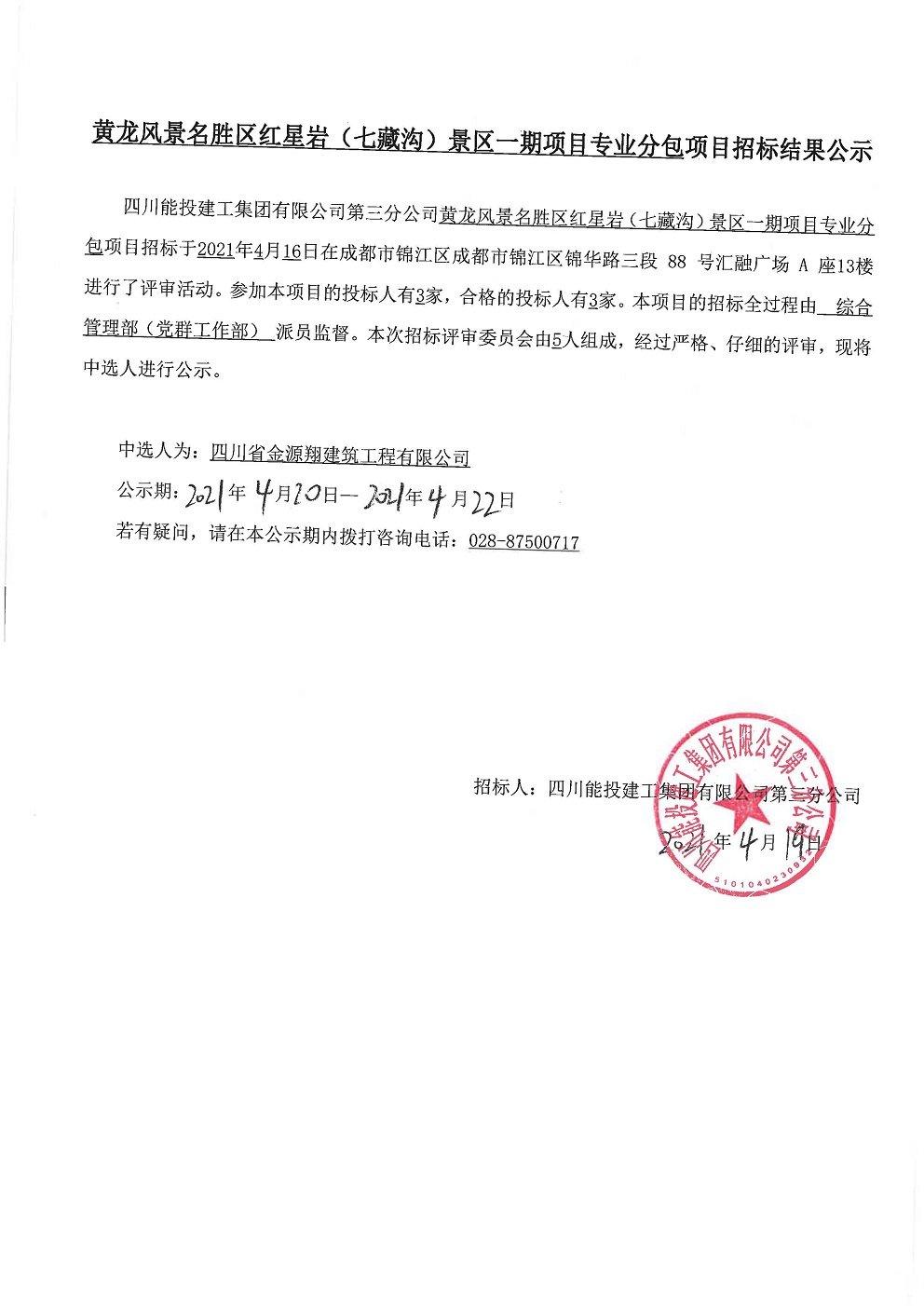 专业分包招标结果公示