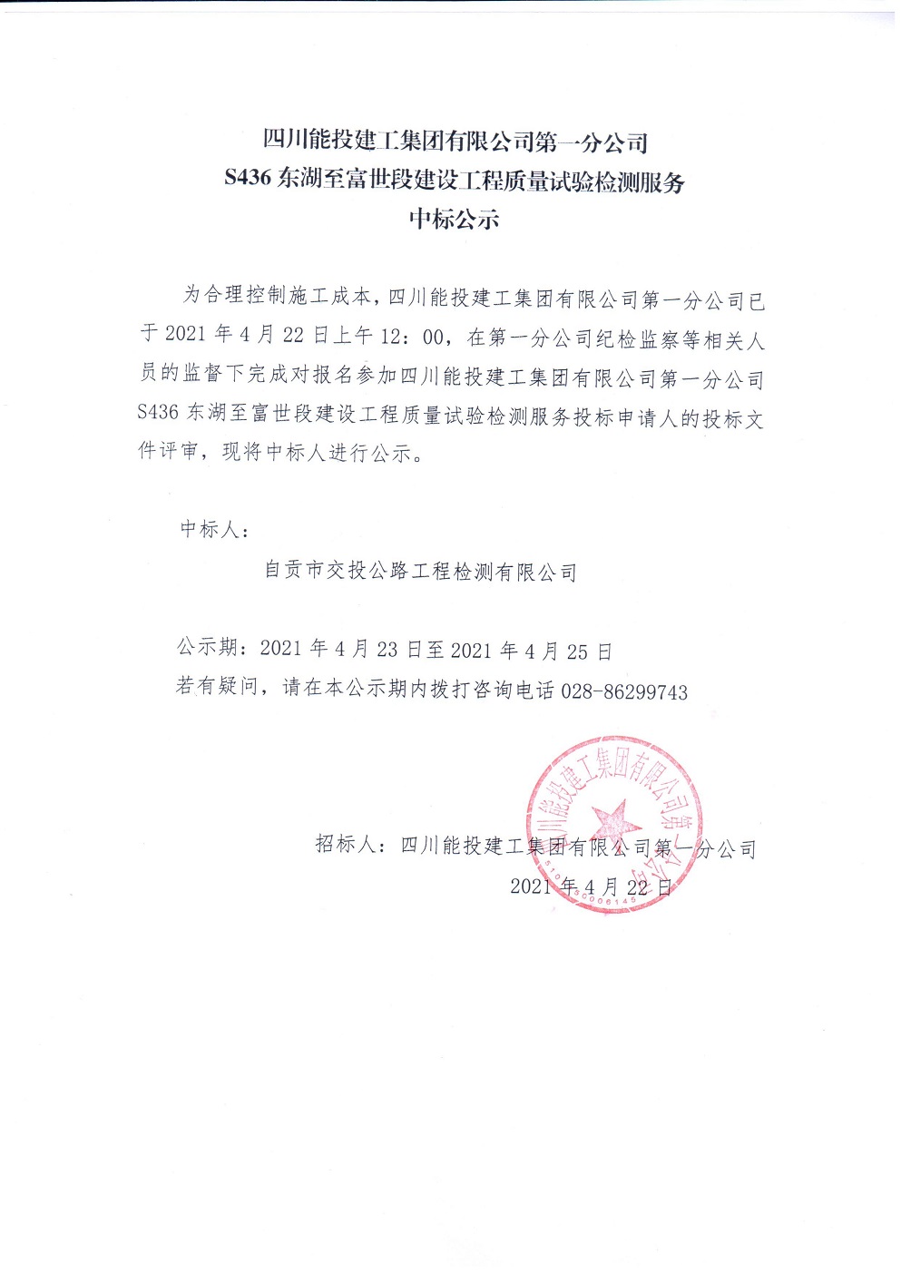 S436东湖至富世段建设工程质量试验检测服务招标结果公示