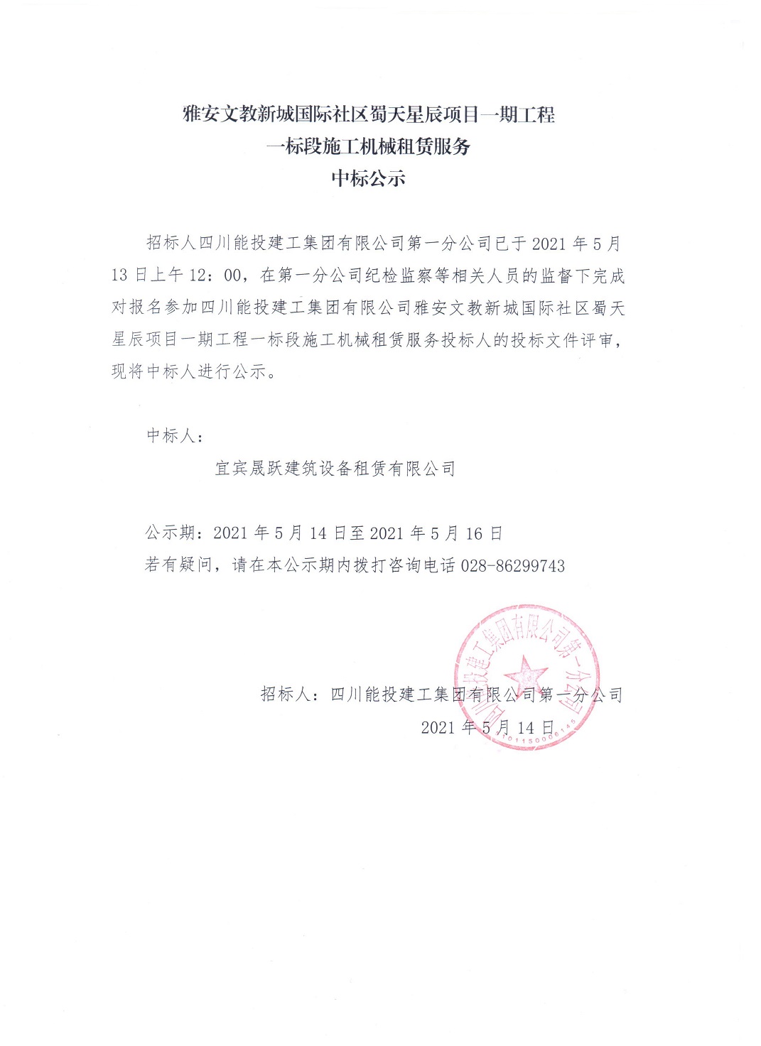 雅安文教新城国际社区蜀天星辰项目一期工程一标段施工机械租赁服务中标公示