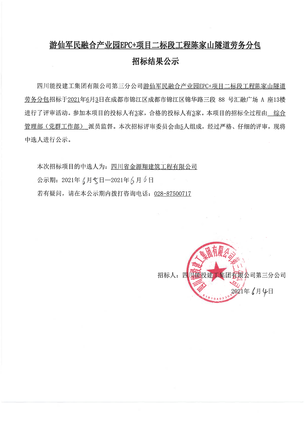 游仙军民融合产业园EPC+项目二标段工程陈家山隧道劳务分包招标结果公示
