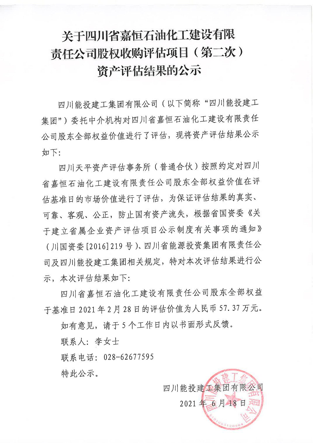 关于四川省嘉恒石油化工建设有限责任公司股权收购评估项目(第二次)资产评估结果的公示
