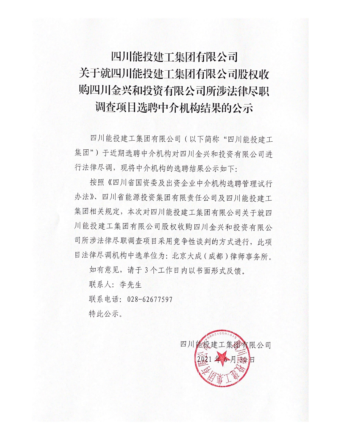 关于就ky开元官方版股权收购四川金兴和投资有限公司所涉法律尽职调查项目选聘中介机构结果的公示