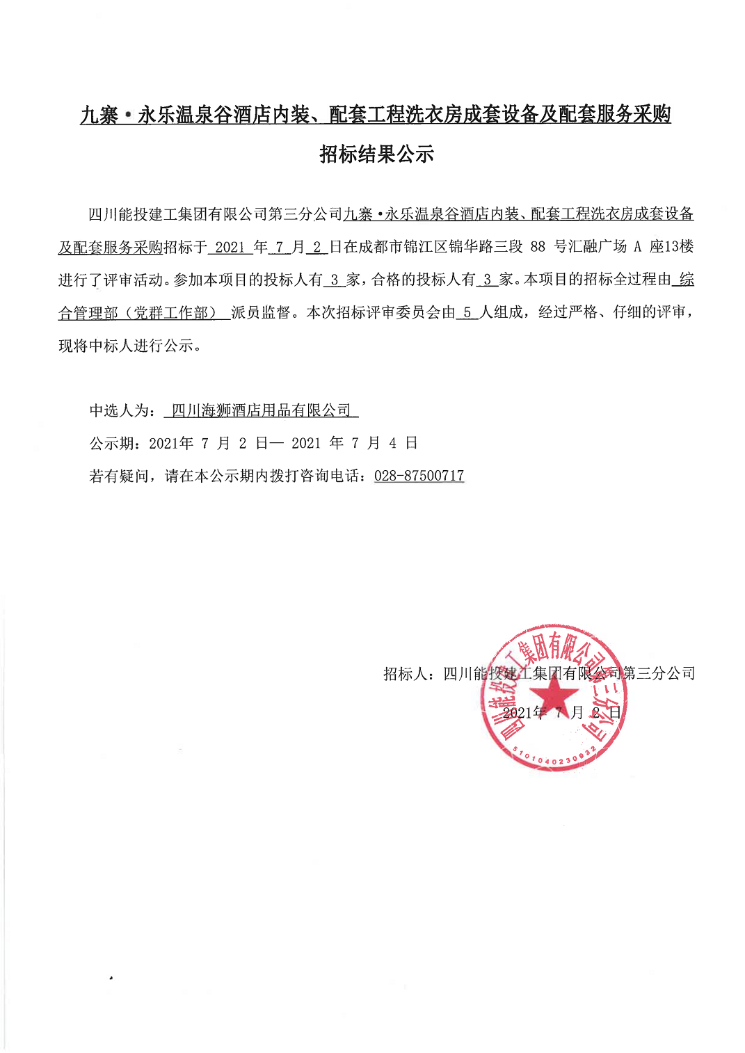 九寨·永乐温泉谷酒店内装、配套工程洗衣房成套设备及配套服务采购招标结果公示