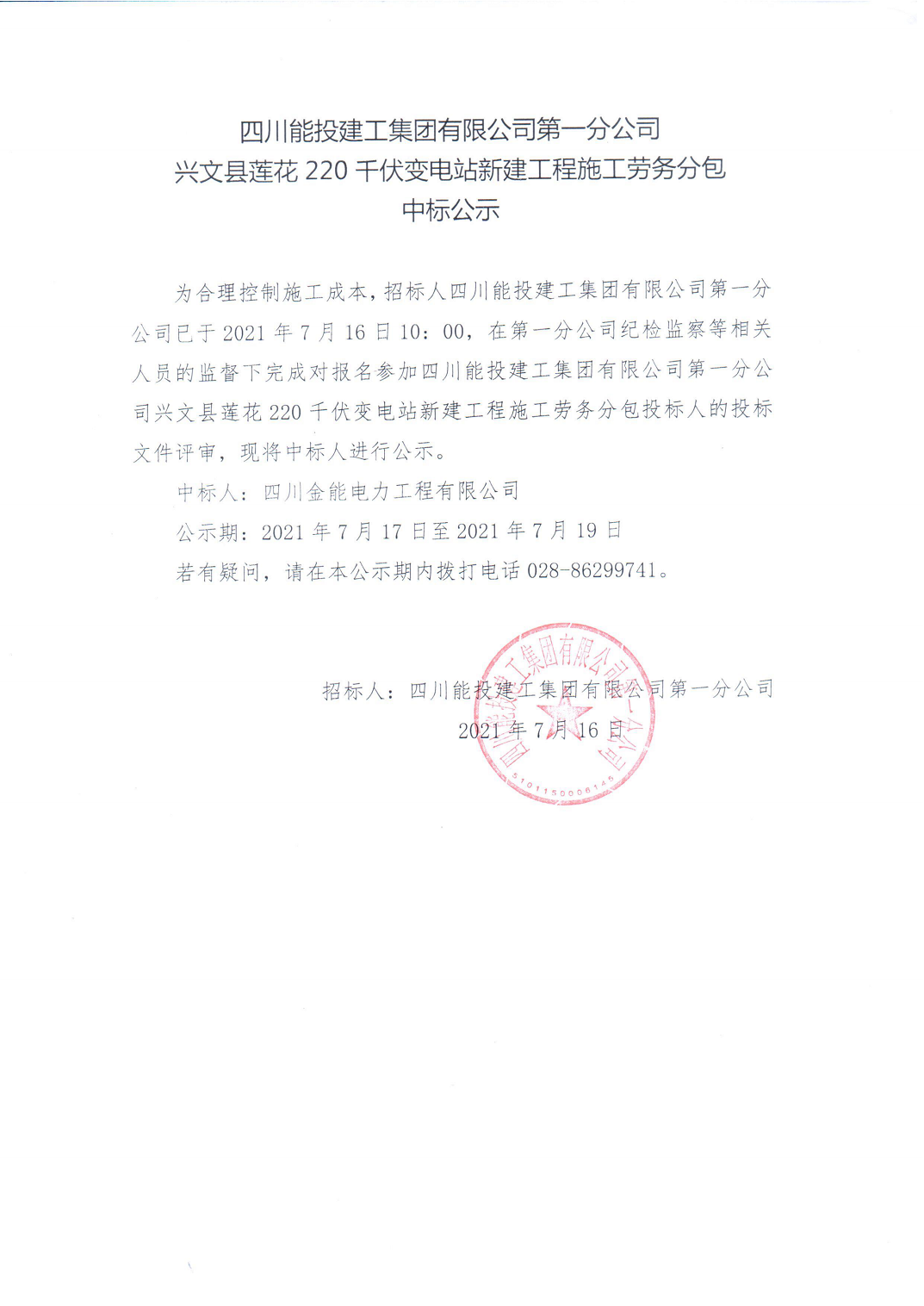 兴文县莲花220千伏变电站新建工程施工劳务分包中标公示