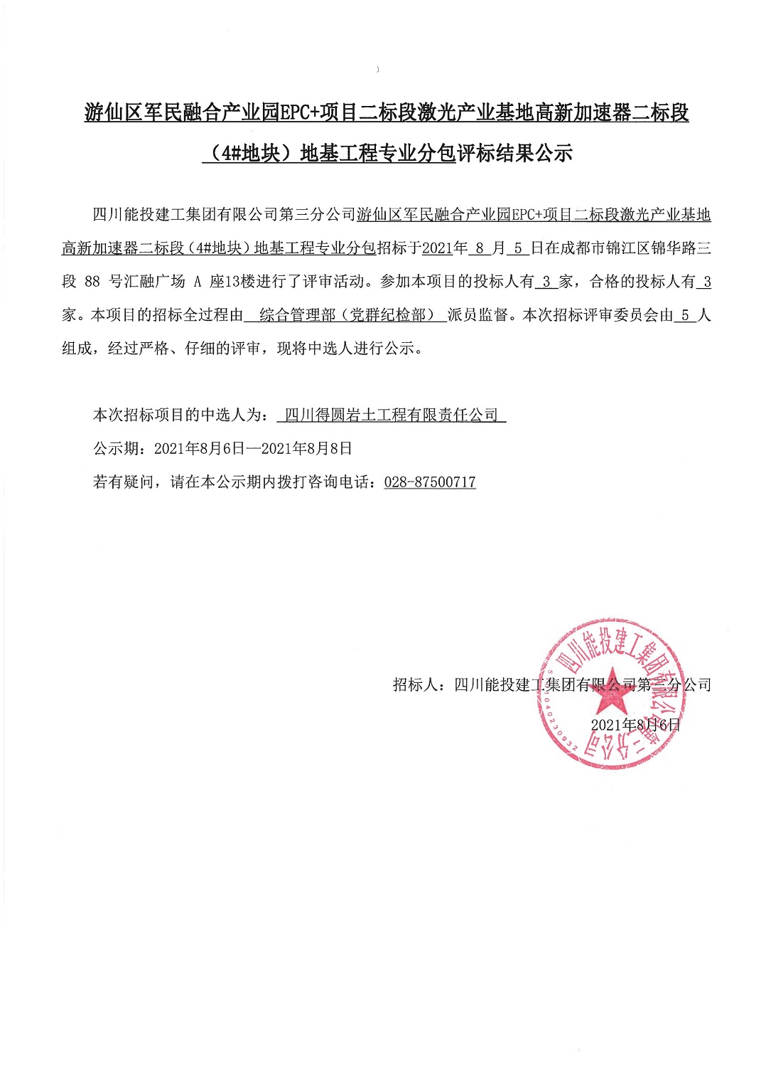 上一条:游仙区军民融合产业园EPC+项目二标段激光产业基地高新加速器一标段(5#地块)地基工程专业分包评标结果公示