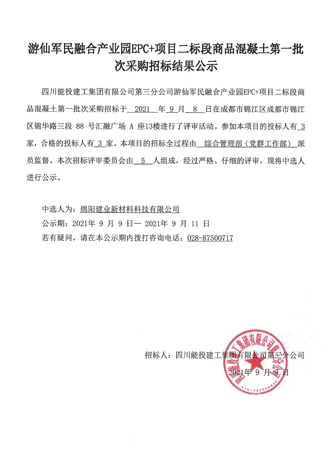 游仙军民融合产业园EPC+项目二标段商品混凝土第一批次采购招标结果公示
