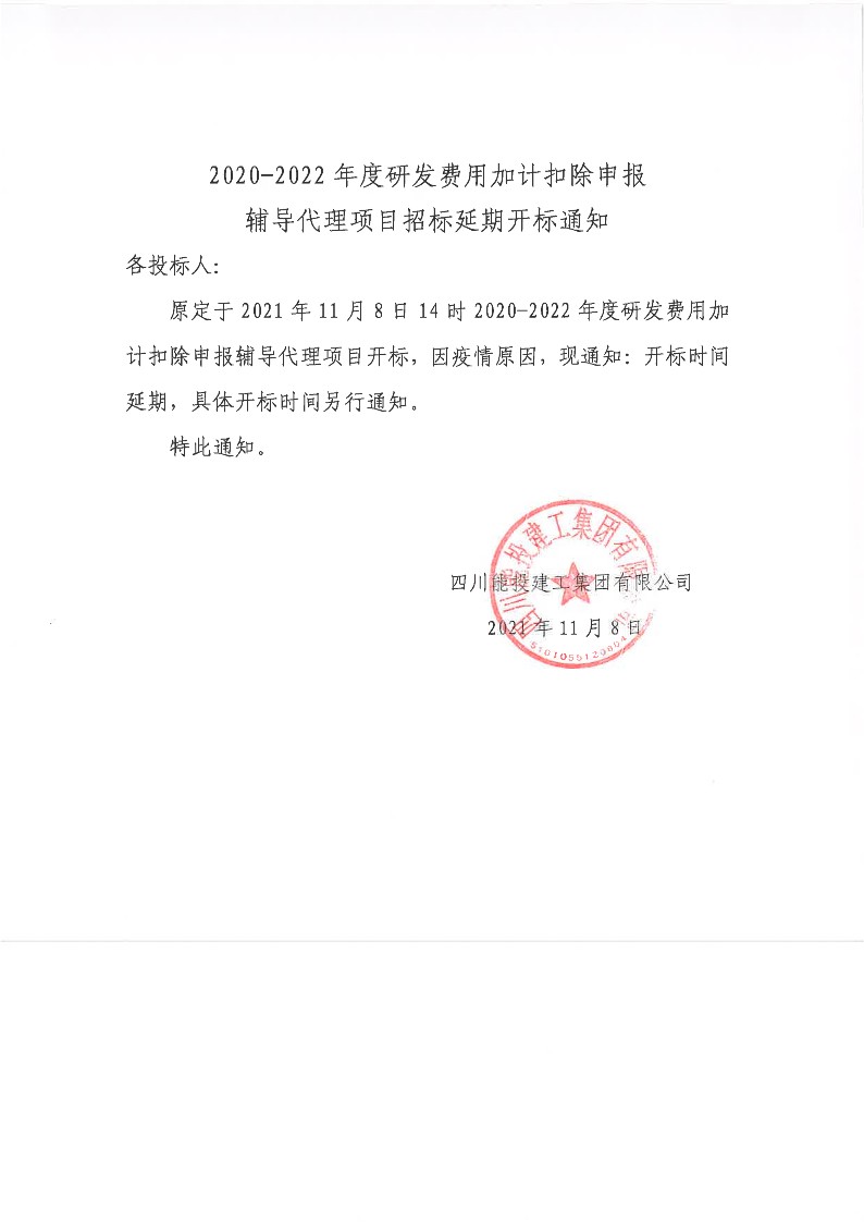 2020-2022年度研发费用加计扣除申报辅导代理项目招标延期开标通知