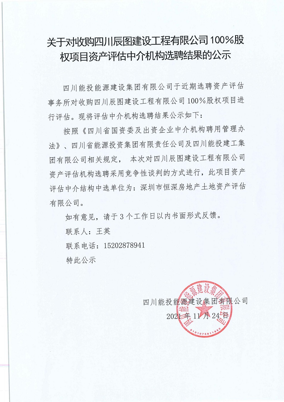 关于对收购四川辰图建设工程有限公司100%股权项目资产评估中介机构选聘结果的公示