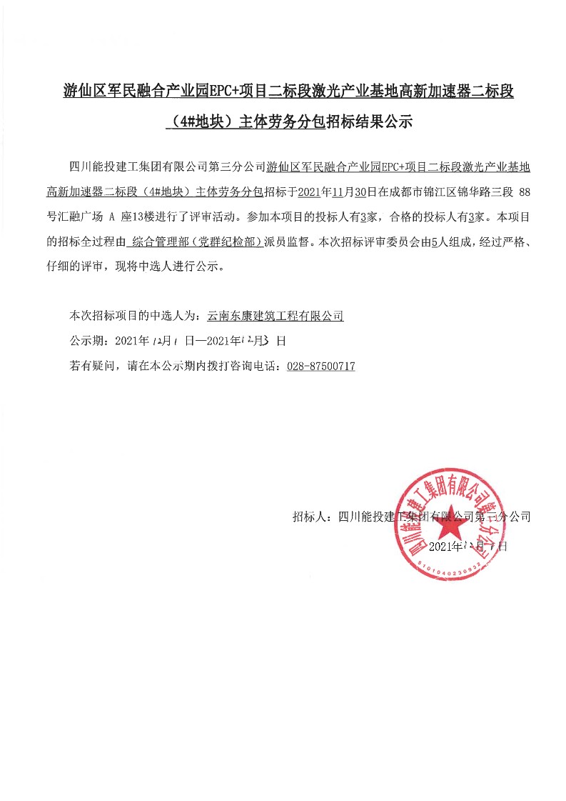 游仙区军民融合产业园EPC+项目二标段激光产业基地高新加速器二标段(4#地块)主体劳务分包招标结果公示