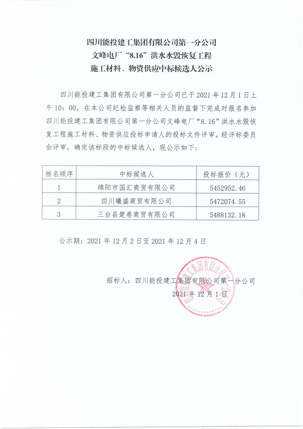 文峰电厂“8.16”洪水水毁恢复工程施工材料、物资供应中标候选人公示