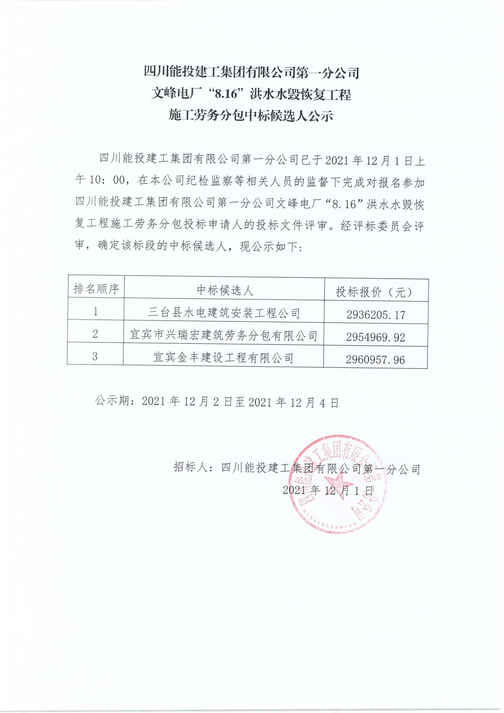 文峰电厂“8.16”洪水水毁恢复工程施工劳务分包中标候选人公示