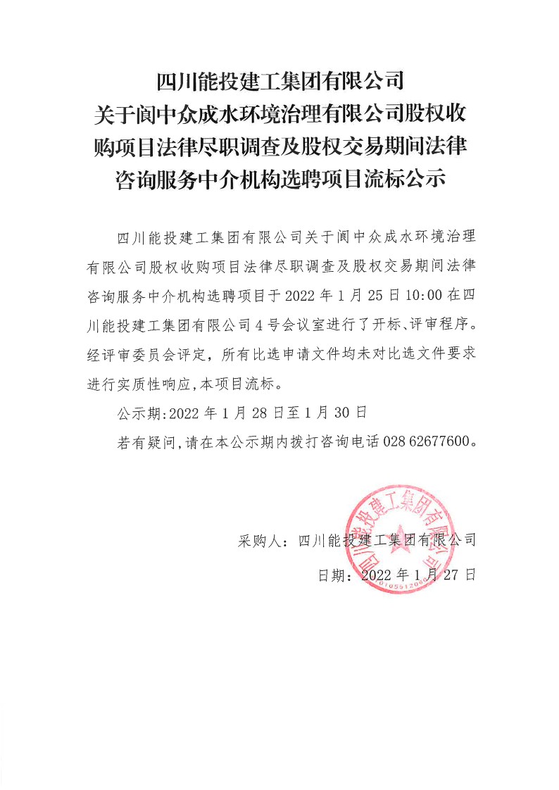 上一条:关于阆中众成水环境治理有限公司股权收购财务尽职调查及审计服务中介机构选聘项目流标公示
