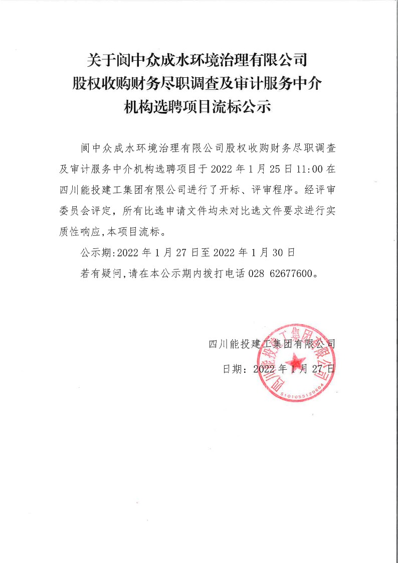 下一条:关于阆中众成水环境治理有限公司股权收购项目法律尽职调查及股权交易期间法律咨询服务中介机构选聘项目流标公示