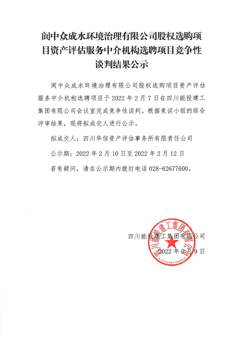 阆中众成水环境治理有限公司股权选购项目资产评估服务中介机构选聘项目竞争性谈判结果公示